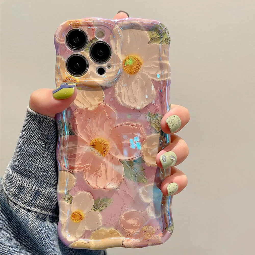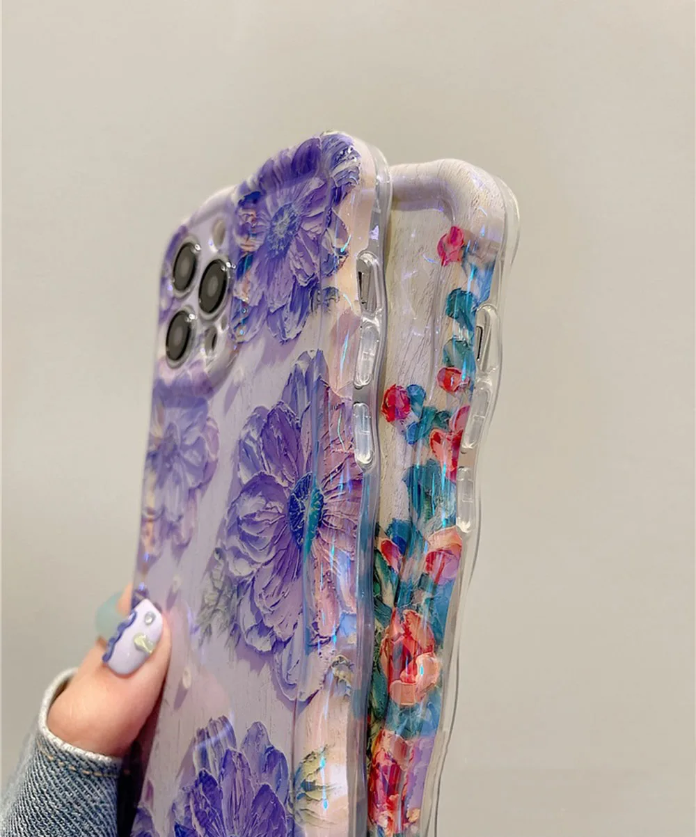 Stylish Phone Case for Iphone 11 12 13 14 15 16 Pro Max Retro Oil Painting Flower Glossy Cute Floral Wave Border Exquisite Cover